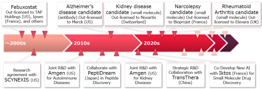 In order to deliver the solutions created through our in-house research to patients around the world, we have actively out-licensed our products to overseas companies. Febuxostat, a gout and hyperuricemia drug created by our laboratory, has become a global product that has been out-licensed to overseas companies and has been marketed in 78 countries, including the United States and European countries. We also focus on out-licensing at the discovery research stage, and have closed multiple deals with large and medium-sized overseas companies.